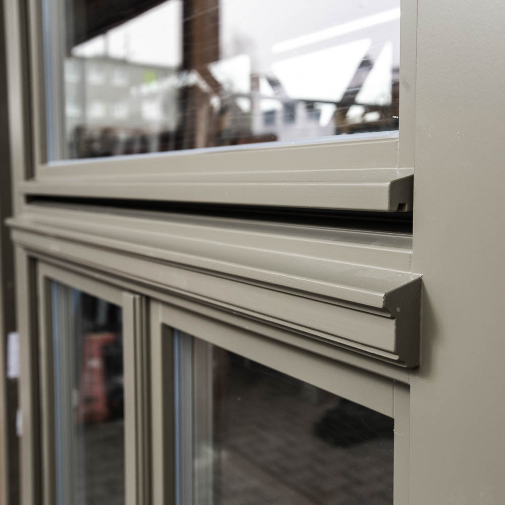 Unsere thermisch getrennte Regenschiene ist in den Farben Weiß, Silber, Mittelbronze und Dunkel-bronze erhältlich. Optional statten wir die Fenster auch mit einer Flügelfalzab-deckung aus. Für denkmal-geschützte Elemente verwenden wir einen massiven vorgesetzten oder eingehangenen Wetterschenkel aus Holz.